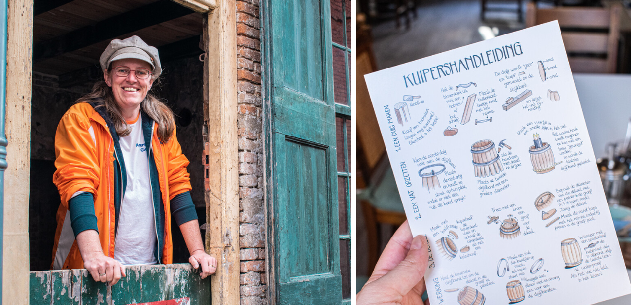 In het kleine museum in de voormalige woonkamer vertellen de gidsen over het ambacht. Je kunt er ook een zelf getekende kuipershandleiding bekijken, gemaakt door stadsgids Inge. Zij maakt ook andere leuke dingen, zoals een Amersfoortse kalender en spellen. Kijk vooral eens in de webshop van Amersfoortse Gidsen! ;-)