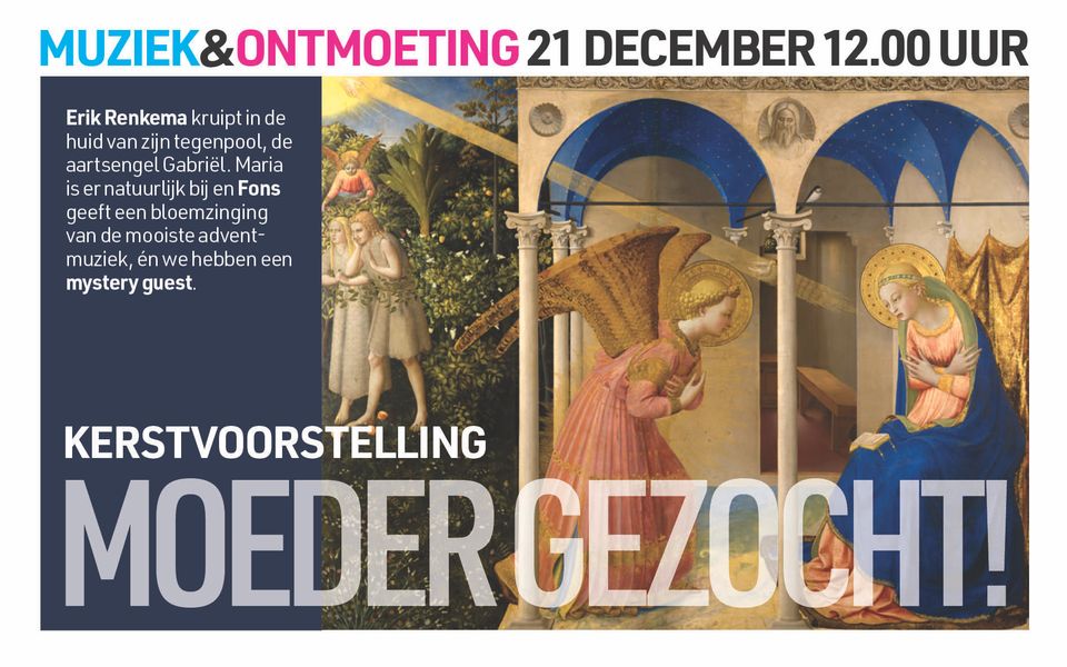 Voor deze voorstelling kruipt Erik Renkema in de huid van zijn tegenpool, de aartsengel Gabriël. Maria is er natuurlijk bij en Fons geeft een bloemzinging van de mooiste advent-muziek, én we hebben een mystery guest bij deze Kerst-editie van Muziek en Ontmoeting. Waar niks mysterieus aan is, is de overheerlijke kerstlunch die na afloop van deze Muziek en Ontmoeting wordt geserveerd!