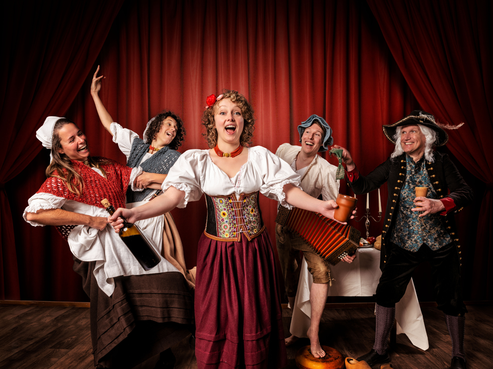 Stap binnen in een bruisende herberg vol muziek, dans en ondeugende verhalen. In Roode Folkloortjes nemen musici en dansers je mee naar een wereld die zweeft tussen vroeger en nu.
