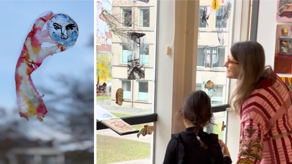 De transparante werken worden daarna samen op het raam geplaatst, waar ze reageren op het licht en elkaar versterken in gelaagde composities.
