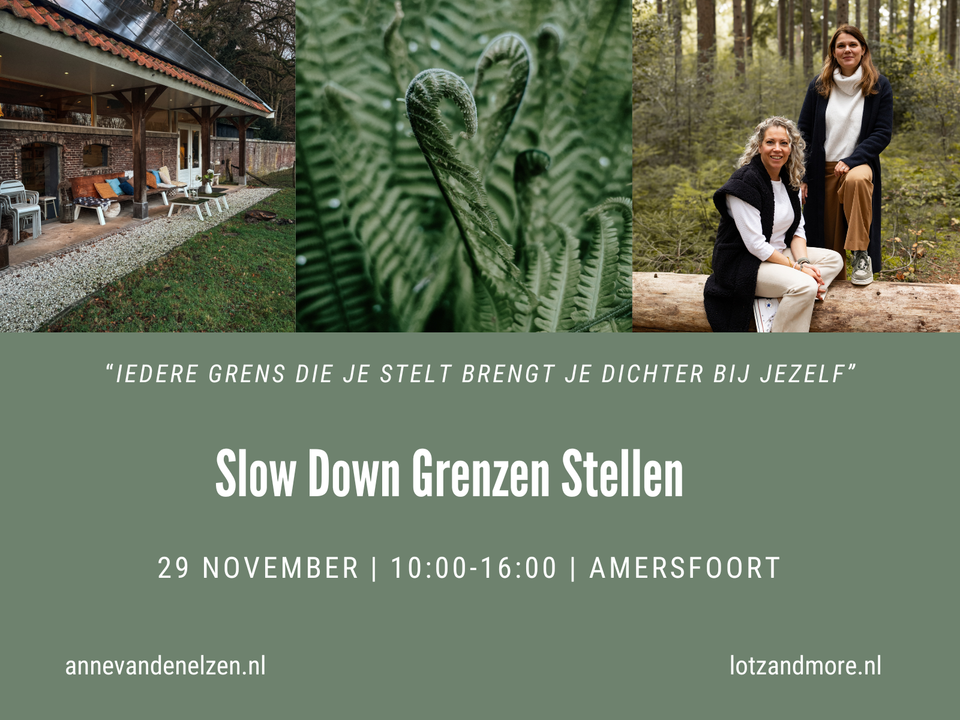 Tijdens deze Slow Downdag Grenzen Stellen krijg je de kans om stil te staan bij jouw persoonlijke waarden en grenzen. Wat zijn jouw grenzen? Hoe bewaak jij je ze? Hoe voel jij je als iemand over jouw grens heengaat? Je leert hoe je op een liefdevolle en zelfverzekerde manier "nee" kunt zeggen, zonder schuldgevoel.