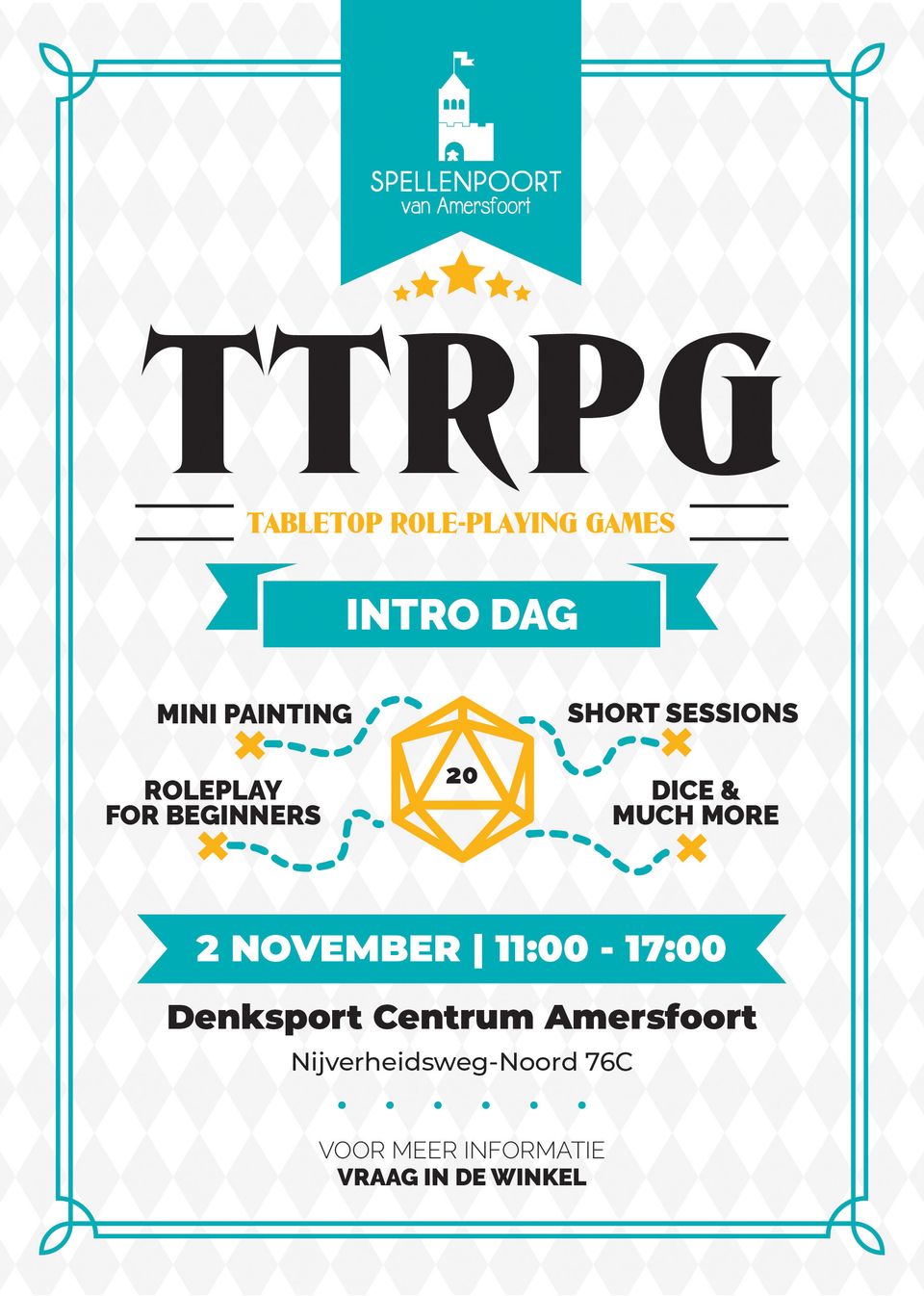 Wij organiseren deze dag om de TTRPG toegankelijker te maken voor een groter publiek. Op deze dag houden we korte introductie sessies waarbij je direct wat speelervaring kunt opdoen, vragen stellen en verhalen beleven. Daarnaast kun je anderen geïnteresseerden ontmoeten en misschien wel een toekomstige 'party' vinden.
