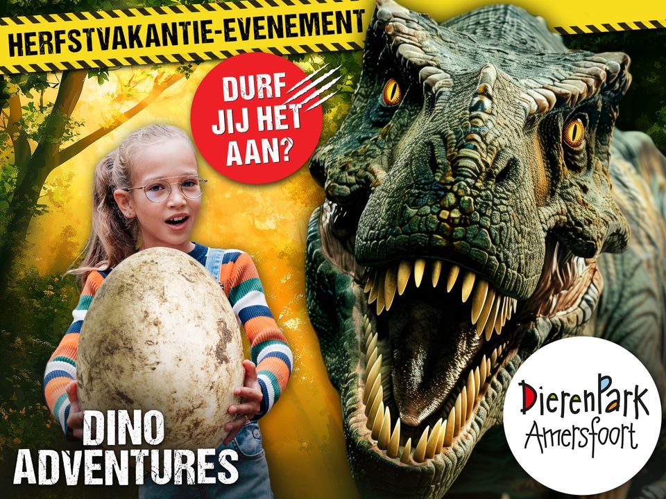 DinoAdventures: beleef van 11 t/m 26 oktober een onvergetelijk avontuur in het Dinobos van DierenPark Amersfoort. Survival door het bos en bezoek de dinobroedplaats. Er zijn zelfs al dino’s uit het ei gekropen. Maar... paniek! Er is een dinojong kwijt. Het dinojong is meegenomen door een gestoorde professor die jongen kweekt tot levensgevaarlijke dinosaurussen. Help jij de Dinorangers om het dinojong weer terug te vinden en de gevaarlijke professor te pakken te krijgen? Je beleeft een onvergetelijk en spannend avontuur vol actie in het Dinobos van DierenPark Amersfoort.