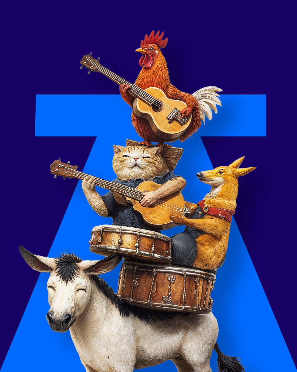 Een afgedankte ezel die accordeon speelt, een schorre henhaan met een viool, een oude hond die saxofoon speelt en een kat die trommelt. Vier dieren vormen gezamenlijk een bont gezelschap. In de ogen van de mensen zijn de dieren te oud of niet meer geschikt om hun werk te doen.Vol energie storten ze zich op een muzikaal avontuur.