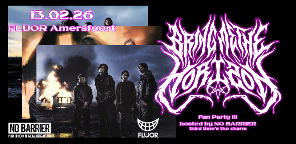 In 2024 hostte NO BARRIER de eerste twee Bring Me-fan parties in TivoliVredenburg en De Helling; de eerste ter ere van het twintigjarig bestaan van de band, de tweede ter ere van hun laatste album POST HUMAN: NeX GEn. Nu brengen de NO BARRIER DJ’s nog één laatste keer een avond lang een eerbetoon aan de band. Van de allerlaatste track ‘Dig It’ tot de allereerste ‘Traitors Never Play Hang Man’; dit is de ultieme Bring Me the Horizon Fan Party!
