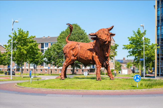 Een grote stalen stier bij de ingang naar de binnenstad van Amersfoort. Het idee is dat mensen gaan nadenken over het spanningsveld tussen stadslev...