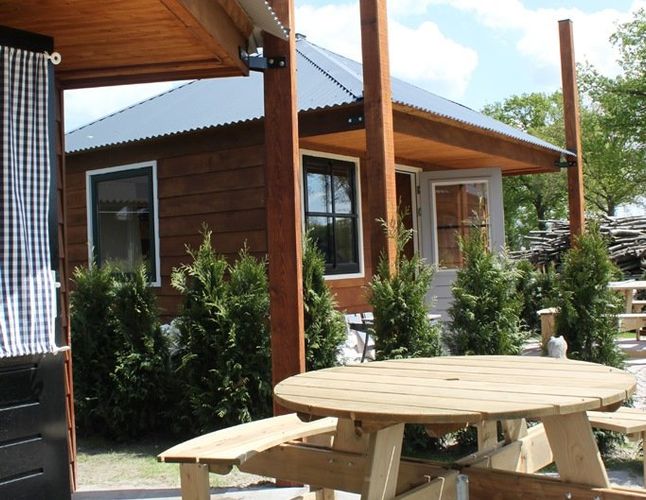 De hooiberghutten staan op een kleine boerderijcamping of bij de boer op het erf.